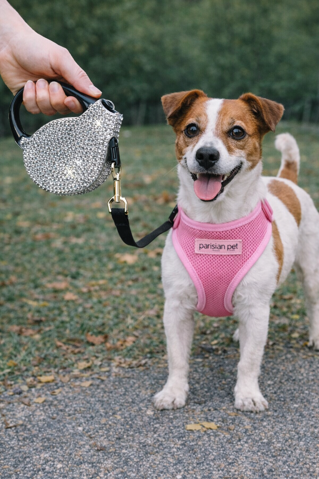 Elevate your retail offerings with the Silver Crystal Retractable Dog Leash, a harmonious blend of sophistication and practicality designed for discerning pet owners. This silver crystal retractable leash showcases a sleek silver design embellished with sparkling crystals, adding a touch of luxury to daily walks. Ideal for retailers seeking luxury pet leashes wholesale, this product combines aesthetic appeal with functional excellence.