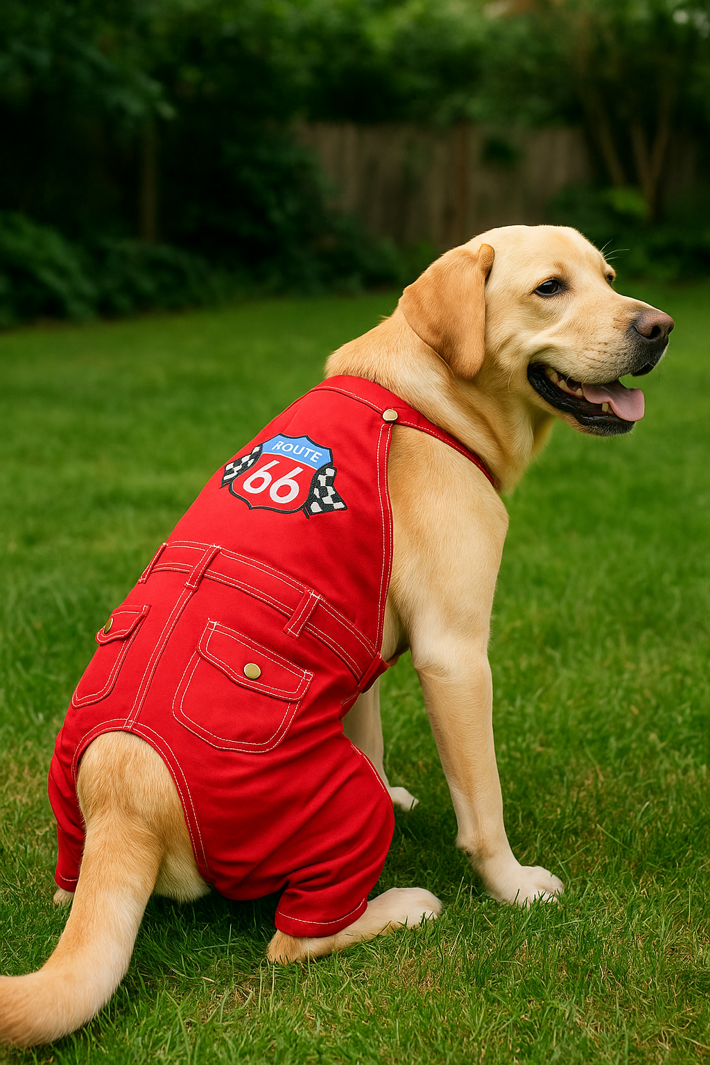 Enhance your wholesale dog jumpsuits collection with our vibrant Route 66 Dog Jumpsuit in Red. This eye-catching piece features a bold red hue complemented by intricate stitched details, brass buttons, and the iconic Route 66 logo embroidered in a striking palette of black, white, red, and blue. Crafted from high-quality materials, this jumpsuit ensures both style and comfort, making it an ideal addition to any pet's wardrobe.